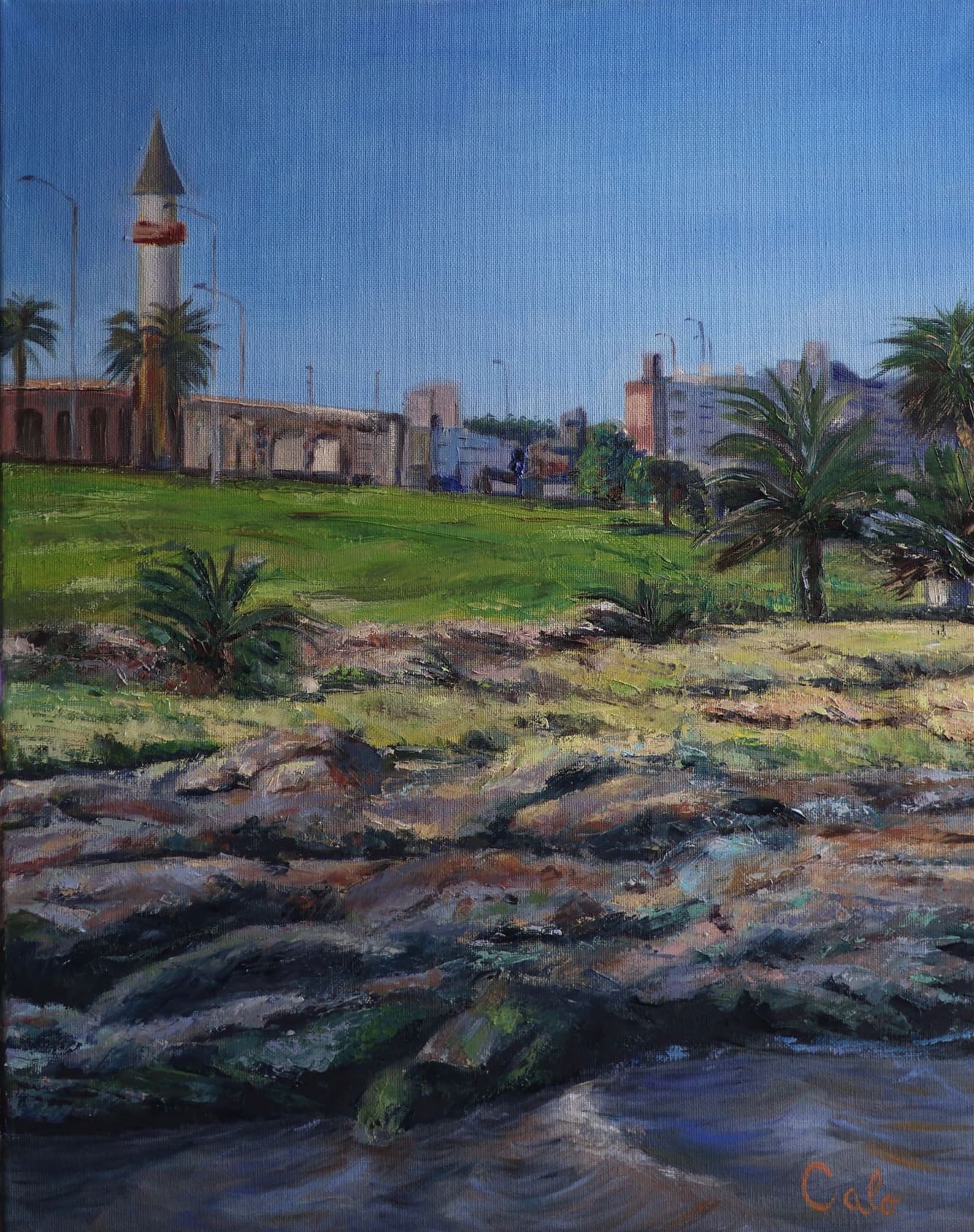 Esta obra busca lograr esa variedad de colores que tienen las rocas, el agua, mezcla de verdes, azules y miles de colores que van surgiendo cuando observamos cada detalle, combinando la naturaleza con la cuidad desde un punto de vista más lejano.